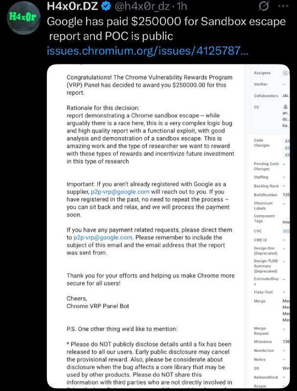 Google pagou 250 mil dolares para um pesquisador por um relatório de sandbox escaping.